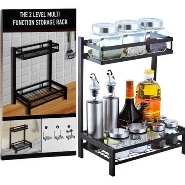 Maximize your kitchen or bathroom storage with this sleek and sturdy 2 Level Multi Function Storage Rack. Designed to streamline your space, it features two spacious tiers, a durable metal frame, and a universal fit—perfect for organizing spices, condiments, cleaning supplies, toiletries, and more. With its smart tiered design, you can clearly view all items at a glance, while the compact and efficient build fits neatly on countertops, inside cabinets, or under sinks.