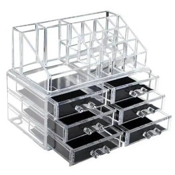The 6 Drawer Cosmetic Organizer is a stylish and practical solution for organizing and displaying your makeup and cosmetics. Made from high-grade acrylic, this clear organizer features an elegant design that complements any decor. It includes six drawers and twelve compartments specifically designed for lipsticks, making it ideal for keeping your beauty products neatly arranged and easily accessible.